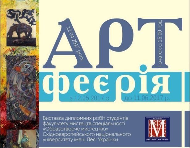 Відкриття виставки творів, дипломних робіт студентів факультету мистецтв, спеціальності «Образотворче мистецтво, декоративне мистецтво, реставрація» Східноєвропейського національного університету імені Лесі Українки «Арт-феєрія» відбудеться 12 травня в Арт-галереї (Центральний універмаг Луцька, 2-й поверх), повідомляє прес-служба Фонду Ігоря Палиці «Тільки разом».