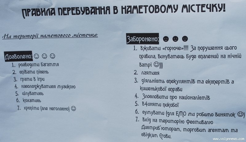 Кожен, хто поселився у містечку, мусив виконувати правила організаторів. Щоправда, пункт про дозвіл розводити багаття ближче до вечора заборонили представники МНС через сильний передгрозовий вітер. Аби не спалити палатки, вогнища загасили.
