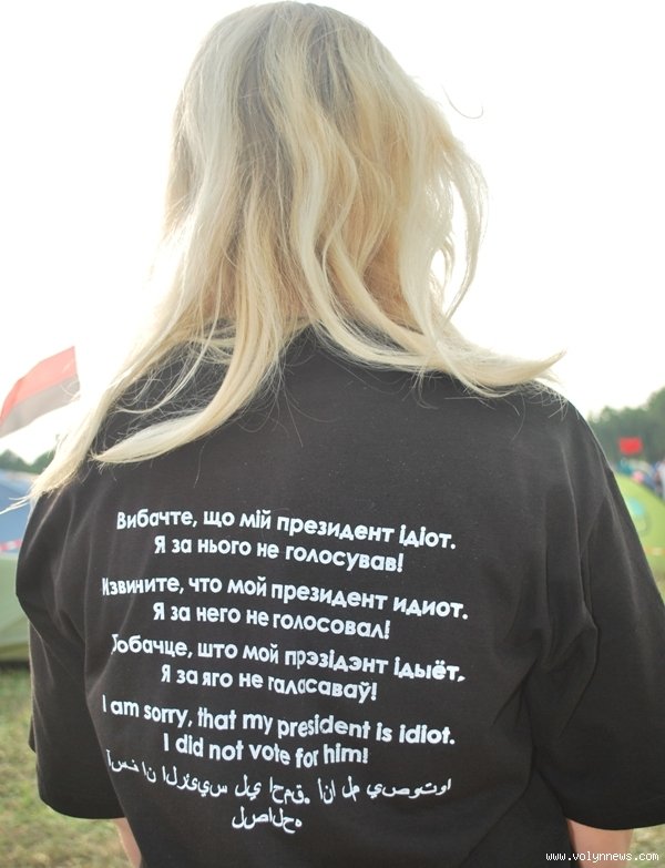 Важко бути декому по-пояс дерев"яними. Але приходиться і то з голови. Що президент клоун то ясно, але там на футболці 5 президентів, бо п"ять мов. В Луганську і Донецьку мову зараз молодь знає краще ніж ви пане Вікторе. Власне я таку на Харківщину прикуплю, але ви будете отут флудити, а я пики бити і захищати напис і не тілько. Далі чому я забалакався за президента. якщо йому заборонити горілчані вироби - фестивалі завершаться і почнеться нарешті величезний фестиваль, але не на його користь. А от додуматись, що той хто протримається день без алкоголю і отримає якийсь сувенір (скажімо ту саму футболку, або навіть брелока) оце вже цікаво. Чи зацікавлена в нас влада щоб молодь не вживав питво? Чи зацікавлені взагалі урядовці в тому, щоб не дати нації спитися? Правильно ви подумки зрозуміли мене. Тож нащо трандіти на фестиваль коли ви нічого навіть не запропонували. До речі. Дарую ідею Бандерштату на майбутнє. Мені сподобалось, навіть незважаючи на те, що я був трохи сам п"яний. Але вибачте - я вже старий алкоголік. Иноді тримаюся а иноді здаюся. Щиро з шанобою - вкв