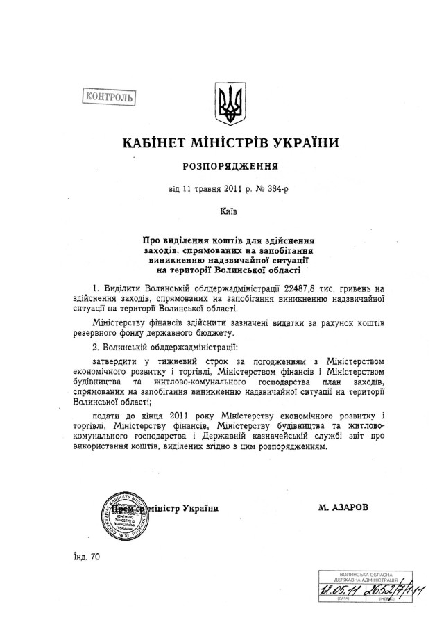 Кабмін виділив Волинській облдержадміністрації 22487,8 тисячі гривень для запобігання надзвичайним ситуаціям, пов’язаним зі шкідливою дією поверхневих та паводкових вод.