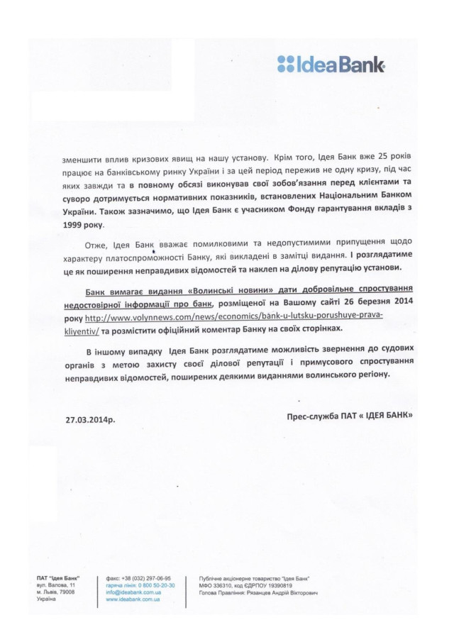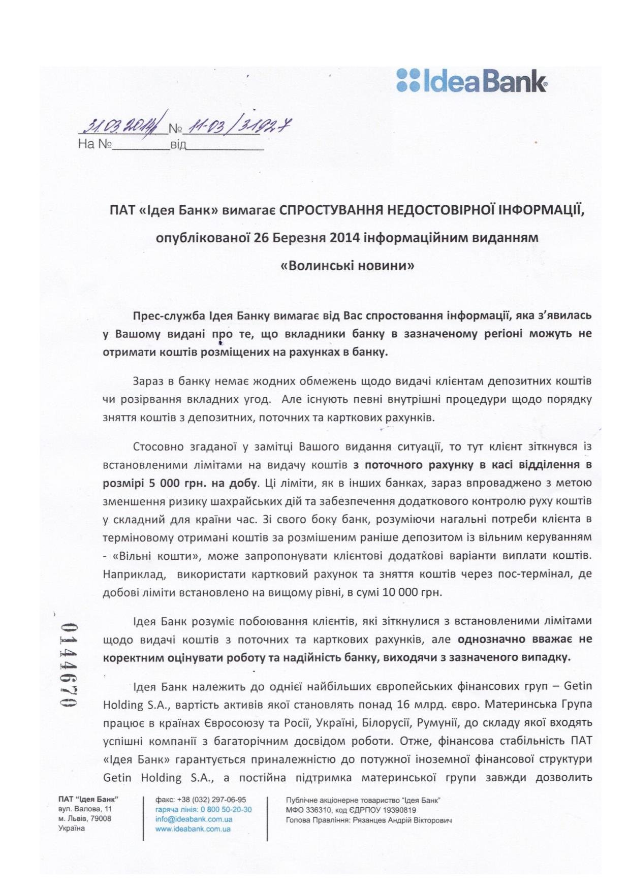 Новина із таким змістом на сайті Інформаційного агентства Волинські Новини була опублікована 26 березня. А вже 31 березня прес-служба Ідея Банку надіслала офіційне спростування вищевказаної інформації.