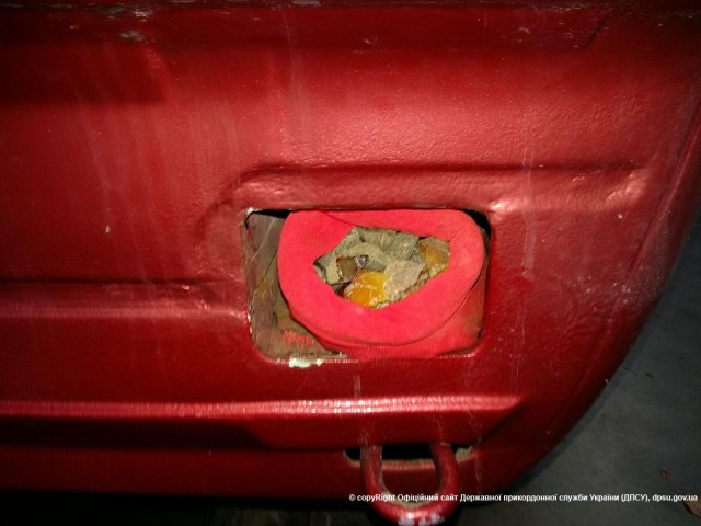 У результаті спільна група у складі співробітників Держприкордонслужби та Державної фіскальної служби виявила в конструктивних порожнинах лівої та правої частини заднього лонжерона та баку для рідини, що використовується для обмиву лобового скла, каміння бурштину вагою 3,3 кілограми. Виявлене каміння вилучили та передали працівникам митниці.