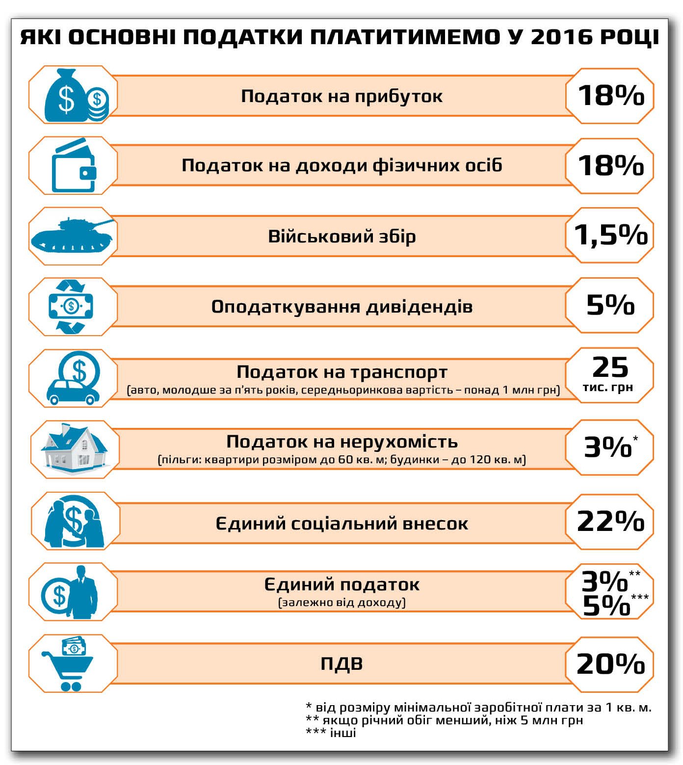 У 2016 році в Україні планують зібрати 595 мільярдів гривень у вигляді податків та зборів, що на 15% більше порівняно з 2015 роком. У 2016 році держава запланувала щонайменше двічі підвищувати рівень мінімальної заробітної плати та прожиткового мінімуму. Таких етапів буде два – з 1 травня та з 1 грудня. Загалом рівень збільшення сягатиме 12,5%, що відповідає прогнозованому рівню інфляції.
