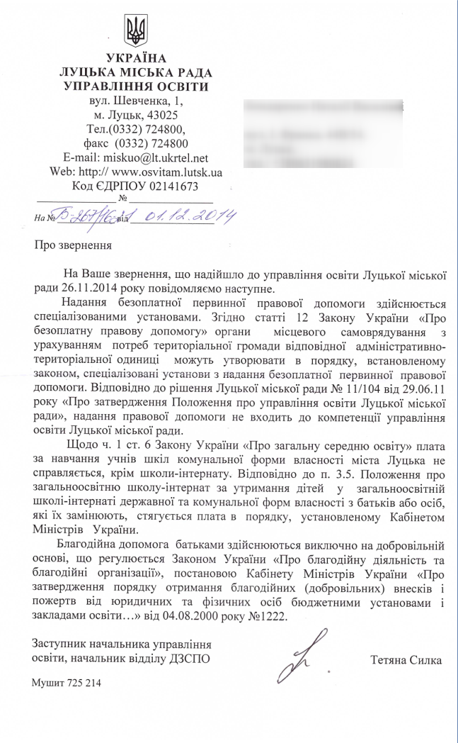В управлінні освіти Луцької міської ради (органу, який здійснює керівництво зокрема школами міста) на прохання роз’яснити правову позицію установи щодо обов’язковості сплати будь-яких коштів за навчання учнів середніх шкіл, відповіли, що плата за навчання учнів шкіл комунальної форми власності Луцька не справляється, виключенням є лиш школа-інтернат.