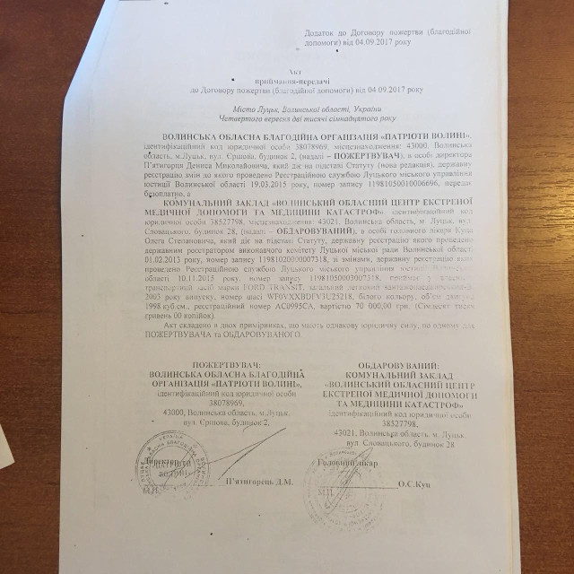 В акті прийому-передачі майна йдеться про те, що директор БФ «Патріоти Волині» Денис П’ятигорець передає 14-річний бус, вартістю усього 70 тисяч гривень комунальному закладу «Волинський обласний центр екстреної медичної допомоги та медицини катастроф». Приймає подарунок головний лікар закладу – Олег Куц.