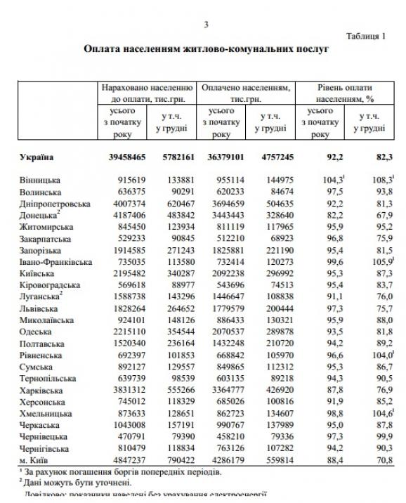 При цьому за централізоване опалення та гаряче водопостачання населення сплатило 98,9%, за утримання будинків, споруд та прибудинкових територій – 98,8%, за вивезення побутових відходів – 98,6%, за централізоване водопостачання та водовідведення – 97,6%, за газопостачання – 95,9%.