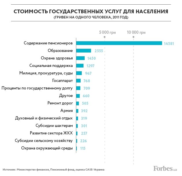 64% (або 16 000 гривень) йде, звичайно ж, на утримання соціально незахищених громадян та пенсійні виплати. Але ще третину коштують різні послуги держави. Тут - і «безкоштовна» освіта, і вартість медичних послуг, і потреби ЖКГ.