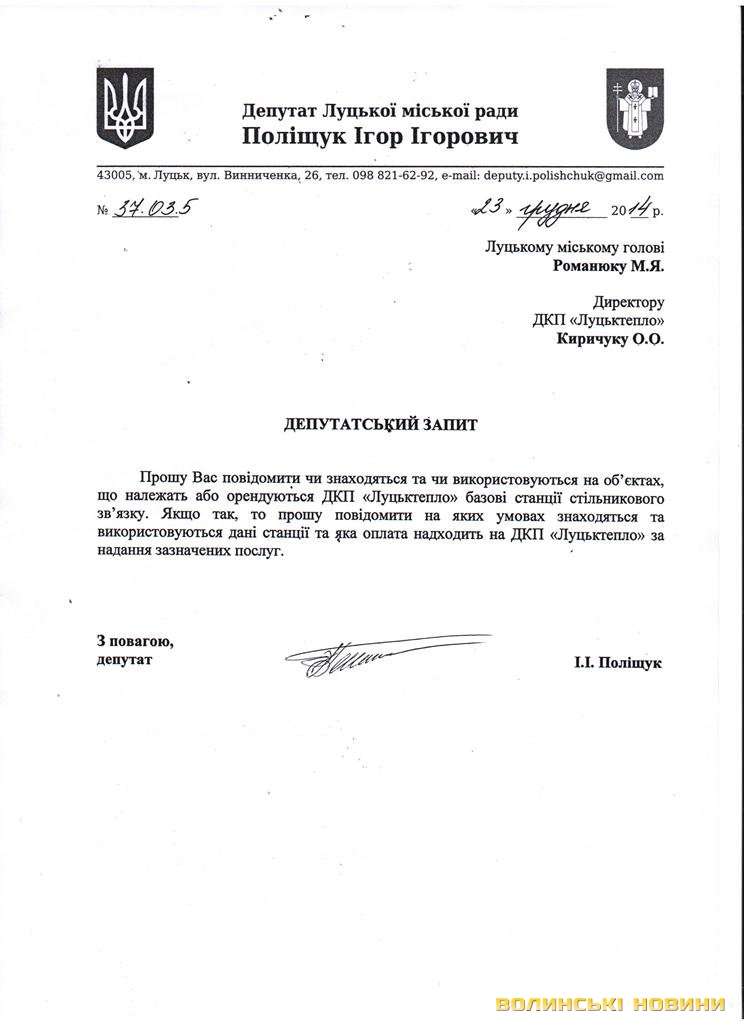 Тож, щоб дізнатися достовірну інформацію, депутат звернувся із проханням повідомити, чи знаходяться та чи використовуються на об’єктах, що належать або орендуються ДКП «Луцьктепло», базові станції стільникового зв’язку. Якщо це так, то він попросив проінформувати, на яких умовах знаходяться й використовуються дані станції та яка оплата надходить на підприємство за надання цих послуг.