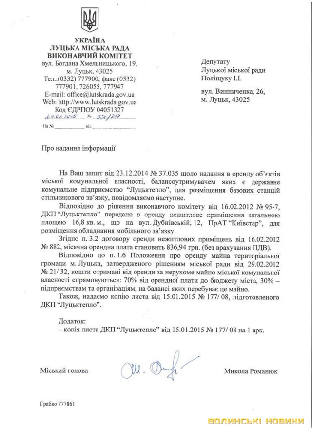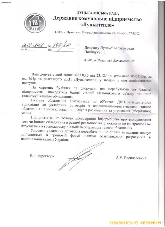 У січні надійшли відповіді на запит від обох адресатів. Так, в ДКП «Луцьктепло» підтвердили, що на окремих будівлях та спорудах, що перебувають на балансі підприємства, знаходяться станції стільникового зв’язку та інше телекомунікаційне обладнання, згідно з укладеними договорами.