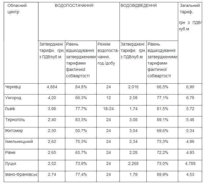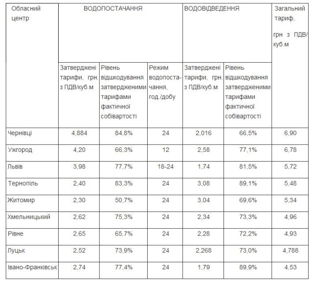 За станом на 01.10.2013 тарифи на послуги централізованого водопостачання та водовідведення для населення у Західному регіоні встановлені наступним чином: