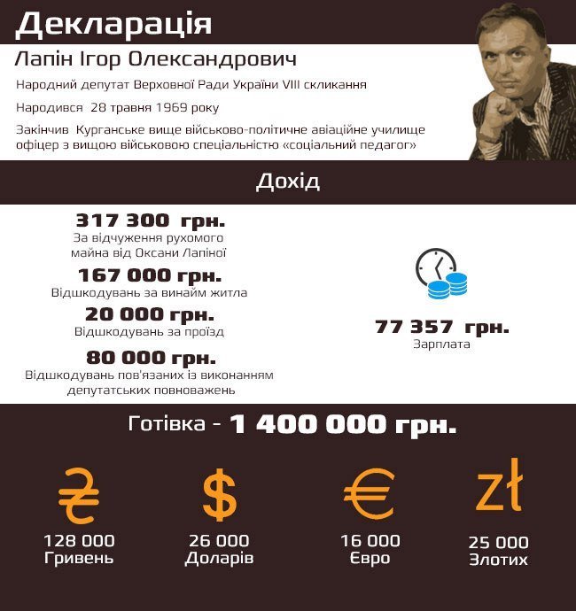 У Верховній Раді Ігор Лапін заробив 77 тисяч гривень зарплати, ще 80 тисяч отримав у якості відшкодувень пов'язаних із виконанням депутатських повноважень. 20 тисяч з держбюджету йому відшкодували за проїзд, ще 167 тисяч за винайм житла. За відчуження рухомого майна від Оксани Лапіної отримав 317 тисяч гривень.