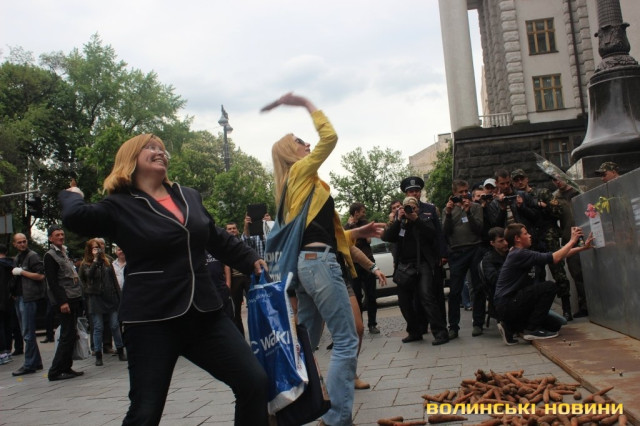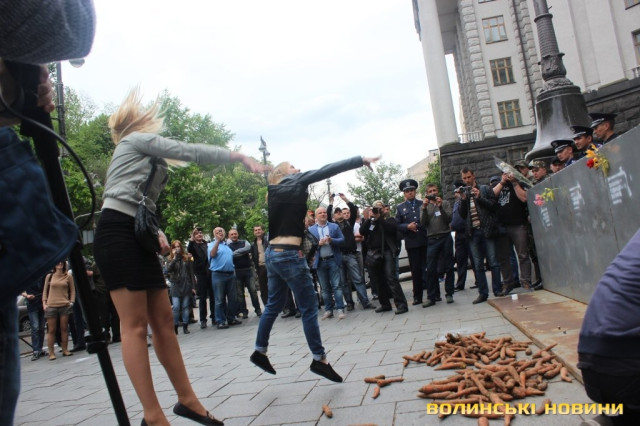 Продовжили акцію протесту під стінами Кабміну, перекривши автівками рух вулицею Грушевського. Автомайданівці, спільно із представниками Фінансового майдану, жбурляли моркву, аби «нагодувати» нею Прем’єр-міністра.