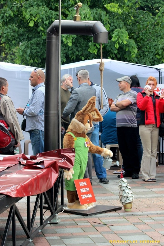 Так, 15 травня під стінами Верховної Ради автмайданівці встановили імпровізовану сцену, «золоту» батарею та шибеницю. Образи можновладців втілили у вигляді кролика, що сидів на діжці із написом «порох». Протестувальники робили світлини у зашморгу з табличкою «мене вбили тарифи» та виступали зі сцени, аргументуючи свою позицію щодо необґрунтованого підняття тарифів та непрозорості формування цін енергоносіїв для населення та скандували «тарифи – під контроль».