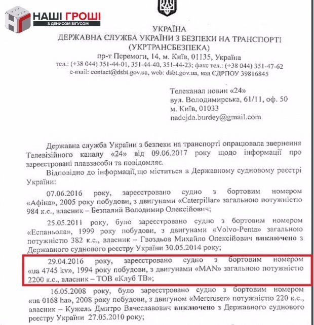 Журналісти програми знайшли цю яхту довжиною у 23 м на закритій парковці яхт-клубу "Рів'єра". Офіційно судно записане на компанію "Клуб ТВ", єдиним власником якого є Олег Малюта.