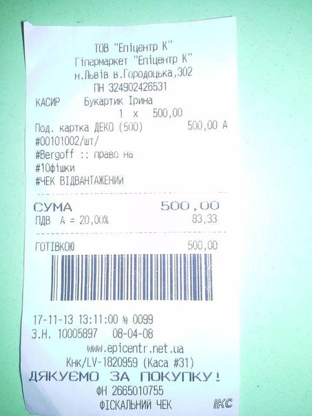 До слова, повернути 500 гривень готвікою згідно зі сертифікатом також відмовили. Аргумент - пройшло 14 днів з дати придбання, або доплатіть 200 гривень або приходьте після Нового року.