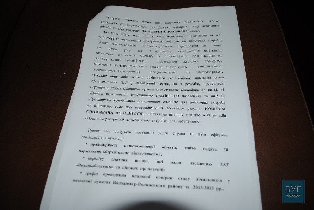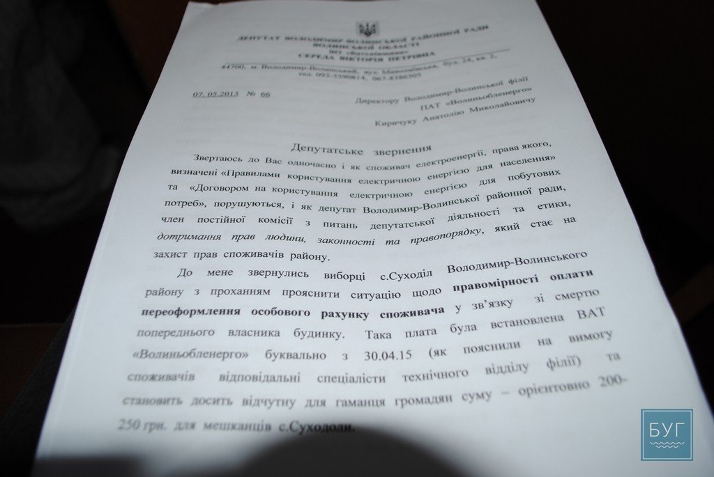 Саме у зв’язку із виявленими фактами порушення “Правил користування електричною енергією для населення”, депутат Вікторія Середа склала відповідний депутатський запит на ім’я директора Володимир-Волинської філії ПАТ “Волиньобленерго” Анатолія Киричука. У ньому депутат попросила пояснити громадянам району, чому з 30-го квітня вони змушені оплачувати якісь додаткові ліцензійні послуги, аби переоформити особовий рахунок.