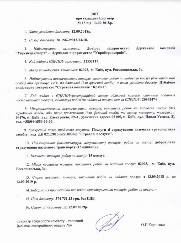 У вересні державне підприємство «Укроборонсервіс» уклало річну угоду на послуги страхування 15 авто зі страховою компанією «Країна» на суму 374,7 тисячі гривень.