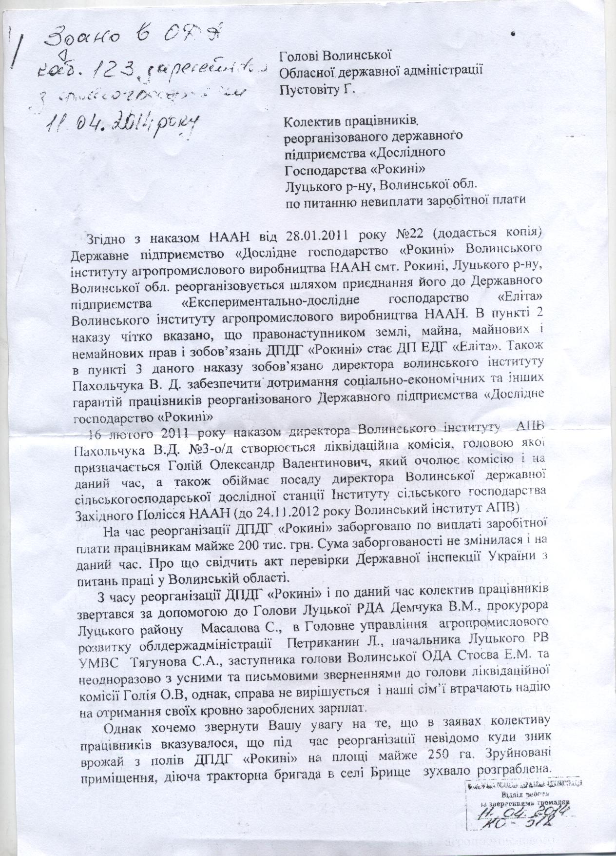 Замість того, щоб повертати борги, підтверджені державними перевірками і результатами ревізій, Олександр Голій намагається очорнити інших, забуваючи і про колектив, який із його вини втратив роботу і лишився без законної заробітної плати. Підтвердженням цьому слугує звернення колективу реорганізованого ДП «Рокині», закріплене підписами працівників. Оригінал звернення доданий нижче.