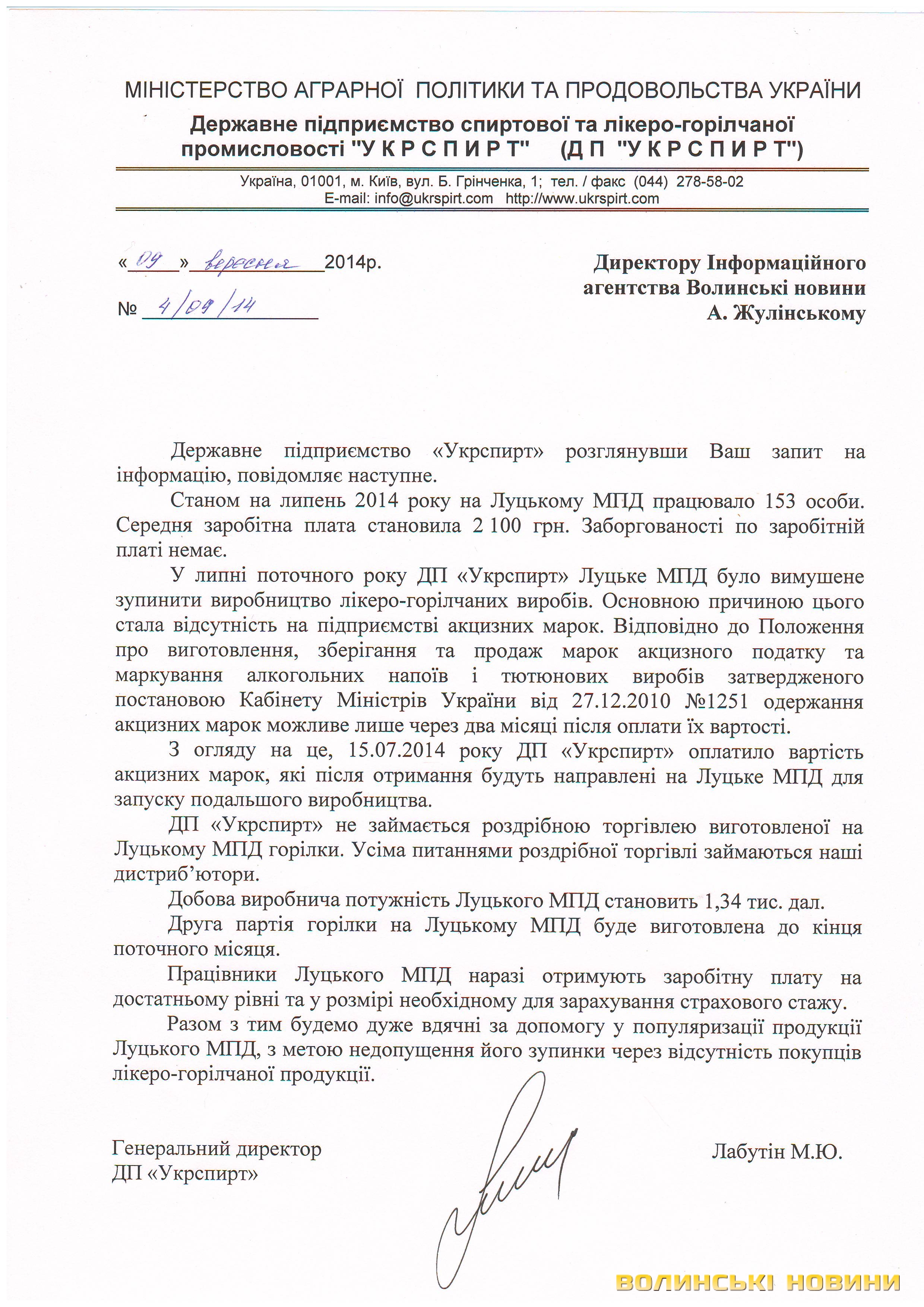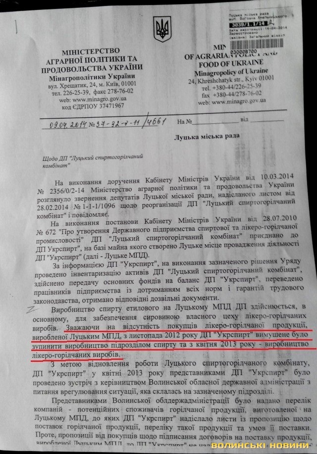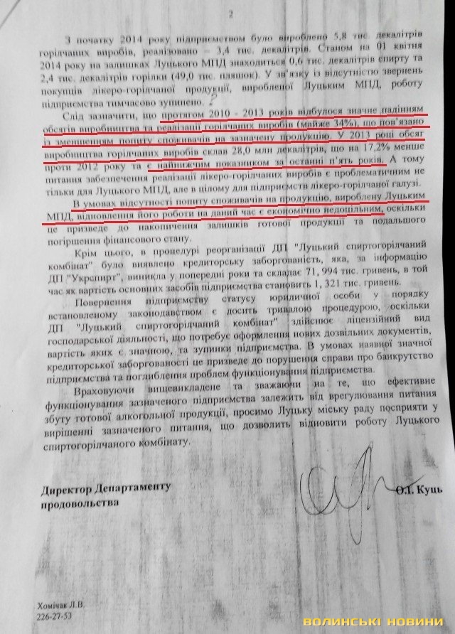 Відповідаючи на інформаційний запит Луцькій міській раді про ситуацію щодо зупинки виробництва, Державне підприємство спиртової та лікеро-горілчаної промисловості «Укрспирт» (ДП «Укрспирт») пояснили це тим, що продукція, раптом після реорганізації, перестала користуватися попитом: «Зважаючи на відсутність покупців лікеро-горілчаної продукції, виробленої Луцьким МПД, з листопада 2012-го року ДП «Укрспирт» вимушене було зупинити виробництво підрозділом спирту та з квітня 2013-го року – виробництво лікеро-горілчаних виробів.Втім, у 2014-му році підприємство знову запустило виробництво й виготовило 5.8 тисячі декалітрів горілчаних виробів, однак реалізували 3.4 тисячі декалітрів. Й виробництво знову припинили. Як пояснювали у відповіді на черговий інформаційний запит, відновлення роботи економічно недоцільне: «Протягом 2010-2013-х років відбулося значне падіння обсягів виробництва та реалізації горілчаних виробів (майже на 34%), що пов’язане із зменшенням попиту споживання на зазначену продукцію. У 2013-му році обсяг виробництва горілчаних виробів є найнижчим показником за останні 5 років. В умовах відсутності попиту споживання на продукцію, вироблену Луцьким МПД, відновлення його роботи на даний час є економічно недоцільним».У міськраді почали бити на сполох, мовляв «завод сплатив за 2010-й рік 62,5 мільйона гривень податків й приносив «золоті яйця» для бюджету Волинської області». Так, депутати Луцької міськради звернулися до Міністерства аграрної політики та продовольства України щодо реорганізації ДП «Луцький спиртогорілчаний комбінат», аби йому повернули статус юридичної особи. Однак столична влада «заблокувала» відновлення Луцького спиртогорілчаного комбінату, про що заявив депутат Луцької міськради Сергій Сівак.