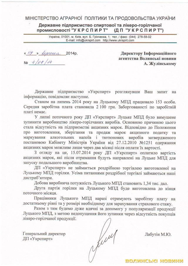 P.S. Скільки ще Луцьке спиртогорілчане підприємство буде припиняти і відновлювати свою роботу - невідомо. Очевидним є одне: поки ніхто з Києва не прагне повернути підприємству власного юридичного статусу, аби Луцький СГК міг на повну відновити свою бувшу славу популярного і якісного виробника горілки.