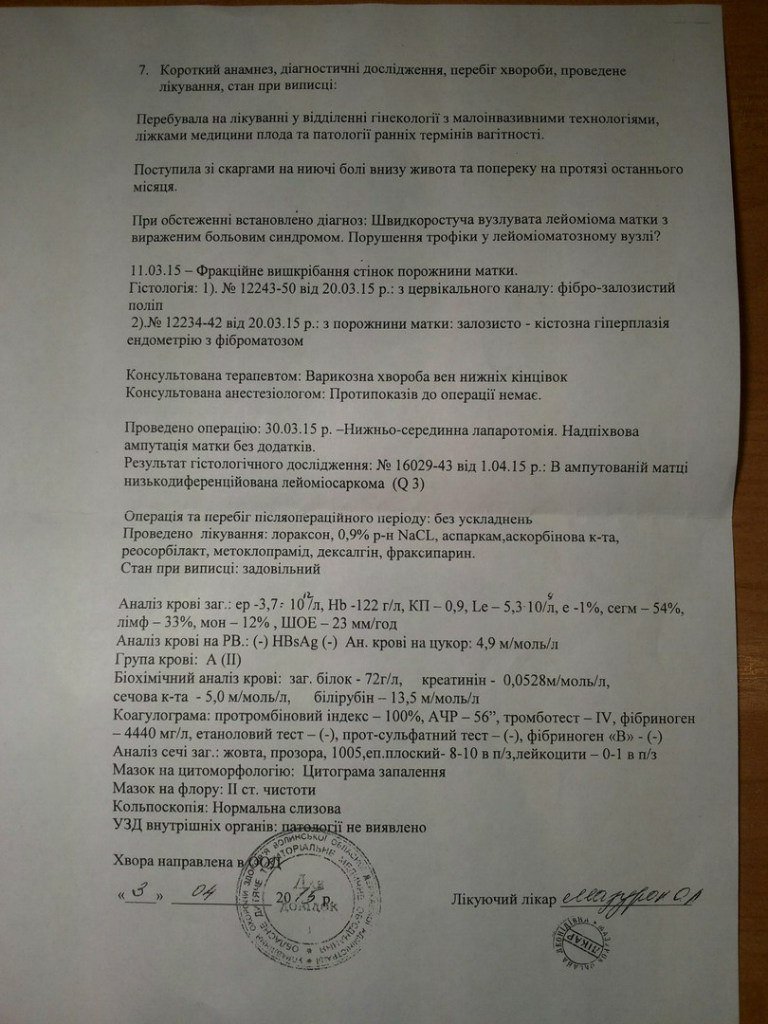 Після повного обстеження організму, провели третю операцію з видалення цих утворів. Результат гістологічного дослідження виявив клітини лейоміосаркоми. Тобто відбувся рецидив.