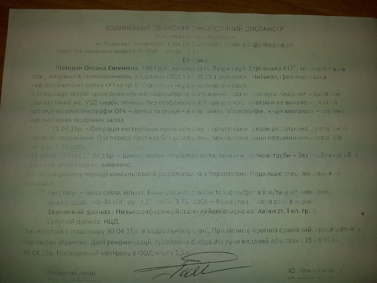 Так, зі слів дочки, у квітні 2015 року її мамі зробили другу операцію з видалення шийки матки з придатками (у Волинському обласному онкологічному диспансері).