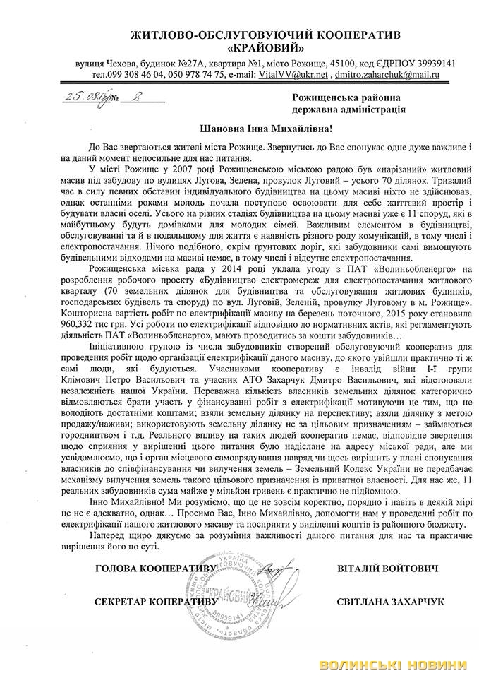 12.10.2015 року - повторне звернення членів кооперативу до голови РДА: «Прохання повторно розглянути лист-звернення та запропонувати можливі варіанти вирішення питання з електрифікації житлового масиву, навіть і на умовах співфінансування, в тому числі із залученням різного роду грантів (на наше переконання, така інформація щодо діяльності різних фондів акумульована у профільних управліннях/відділах РДА)».