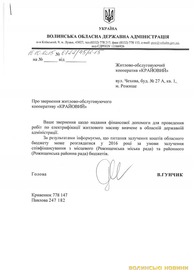 21.01.2016 року – відповідь з облради за підписом першого заступника О.В.Пирожика: «…повторне звернення від 4 січня направлене для розгляду Рожищенській міській раді з метою вирішення питання про фінансування зазначених робіт за кошти міського бюджету».