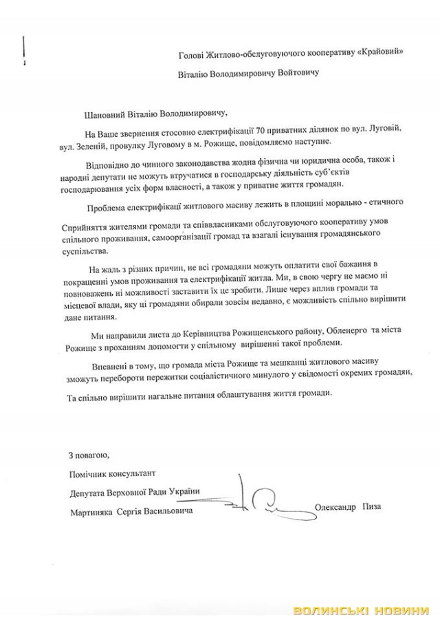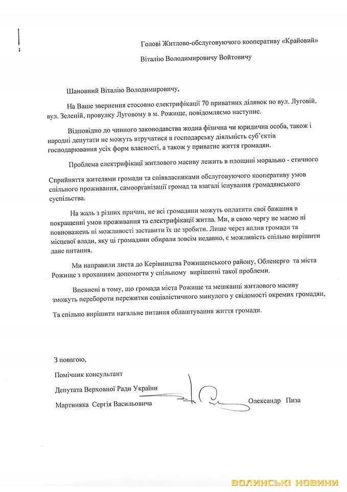 23.01.2016 року – відповідь з громадської приймальні депутата Сергія Мартиняка за підписом його помічника Олександра Пизи. А от Олександр Зіновійович переконаний, що питання електрифікації приватних ділянок «…лежить у площині морально-етичного сприйняття жителями громади та співвласниками обслуговуючого кооперативу умов спільного проживання… На жаль, з різних причин не всі громадяни можуть оплатити свої бажання в покращенні умов проживання та електрифікації житла… Ми, своєю чергою, не маємо ні повноважень, ні можливості заставити їх це зробити… впевнені, що громада Рожища та мешканці житлового масиву зможуть перебороти пережитки соціалістичного минулого у свідомості окремих громадян». І тут же «переживатєльний» помічник нардепа відправляє звернення на ім’я голови РДА, обленерго та мера з проханням звернути увагу на це питання.У цьому випадку нічого іншого, як окрім безсмертної фрази Остапа Бендера «Не учите меня жить, лучше помогите материально», в голову не приходить. Для чого ми обираємо таких депутатів? За смітники із написом «Чисте довкілля» чи ще за якісь примарні речі?