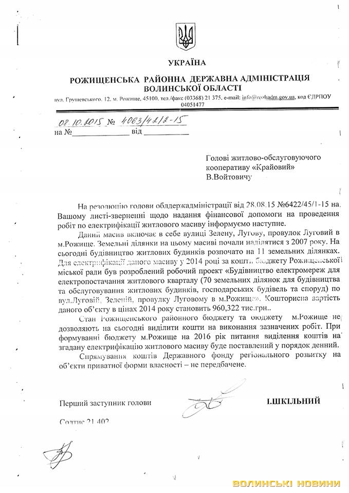 Основна частина тексту переповідає звернення, тобто не несе жодної цінної інформації, а в останньому абзаці: «стан Рожищенського районного бюджету та бюджету міста Рожища не дозволяють на сьогодні виділити кошти на виконання зазначених робіт. При формуванні бюджету Рожища на 2016 рік питання виділення коштів на згадану електрифікацію буде поставлене на порядок денний».