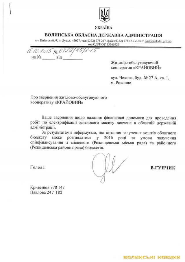 12.10.2015 року - відповідь від облради: «ваше звернення направлене для розгляду Рожищенській міській раді з метою вирішення питання про фінансування зазначених робіт за рахунок коштів міського бюджету міста Рожище». І знову те ж саме…