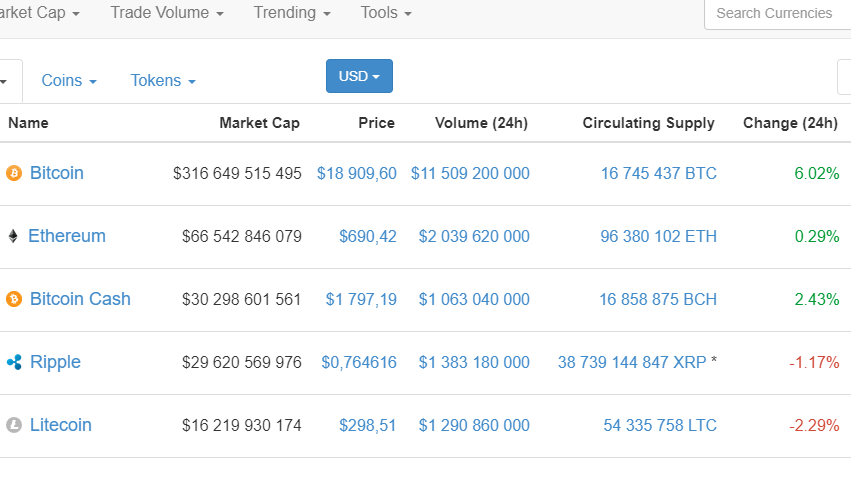 Станом на вечір 16 грудня курс біткоїна перевищив позначку в 18,9 тисяч доларів.