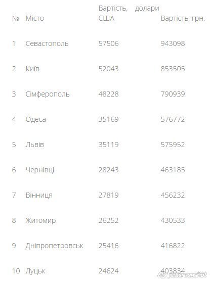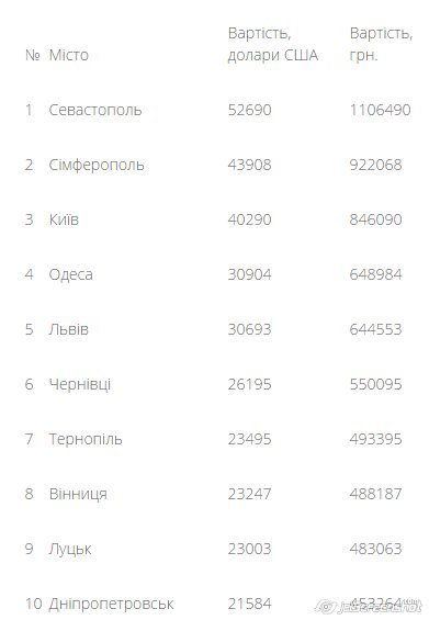 Звісно, ціни в різних регіонах суттєво відрізняються. Ще з кінця 2014 року вперше найдорожчими в Україні стали квартири в Севастополі окупованого Криму. У січні там за «однушку» просили 57 506 доларів (943 098 гривень).