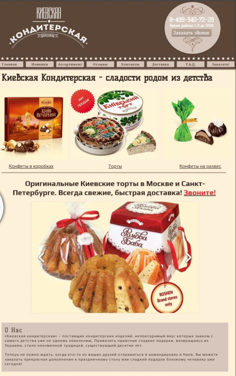 Торти, зефір, бісквіти, цукерки – це далеко не весь перелік продукції «Roshen», яку можна купити в «Київській кондитерській» Москви. Сайт віртуального магазину ласощів повідомляє, що поставки здійснюються прямо з Києва до дверей замовника в Москві і Санкт-Петербурзі.