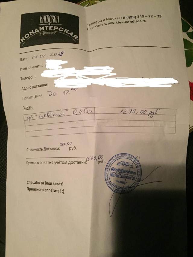 На тому кінці телефонного дроту оголошують суму замовлення спільно з доставкою – 1600 рублів (670 гривень). Оплатити продукт пропонують при його отриманні. А ось отримати можливо буде лише з 12:00, так як в Москві торт опиниться тільки до 11 ранку. Примітно, що саме в такий час, згідно залізничному розкладу, на Київський вокзал в Москву прибувають два українських потяги.