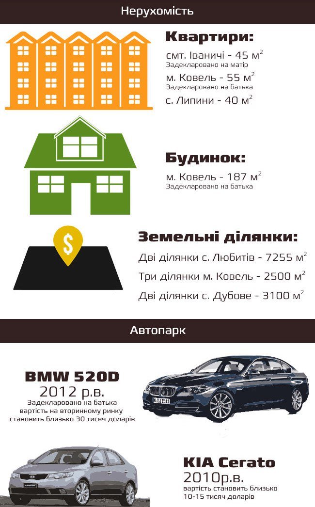 За 2015 рік депутат задекларував 1,4 мільйона в гривневому еквіваленті на той час: 128 тисяч гривень, 26 тисяч доларів, 16 тисяч євро, 25 тисяч польських злотих – все готівкою.