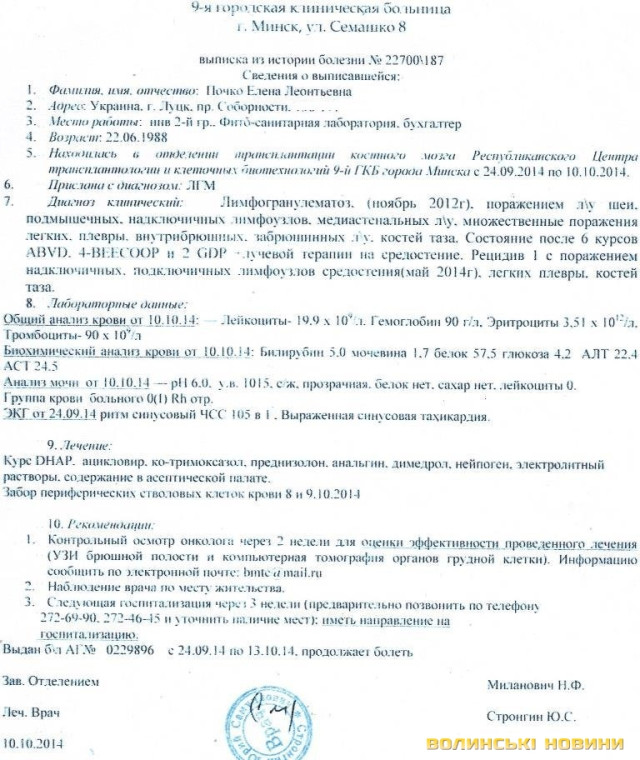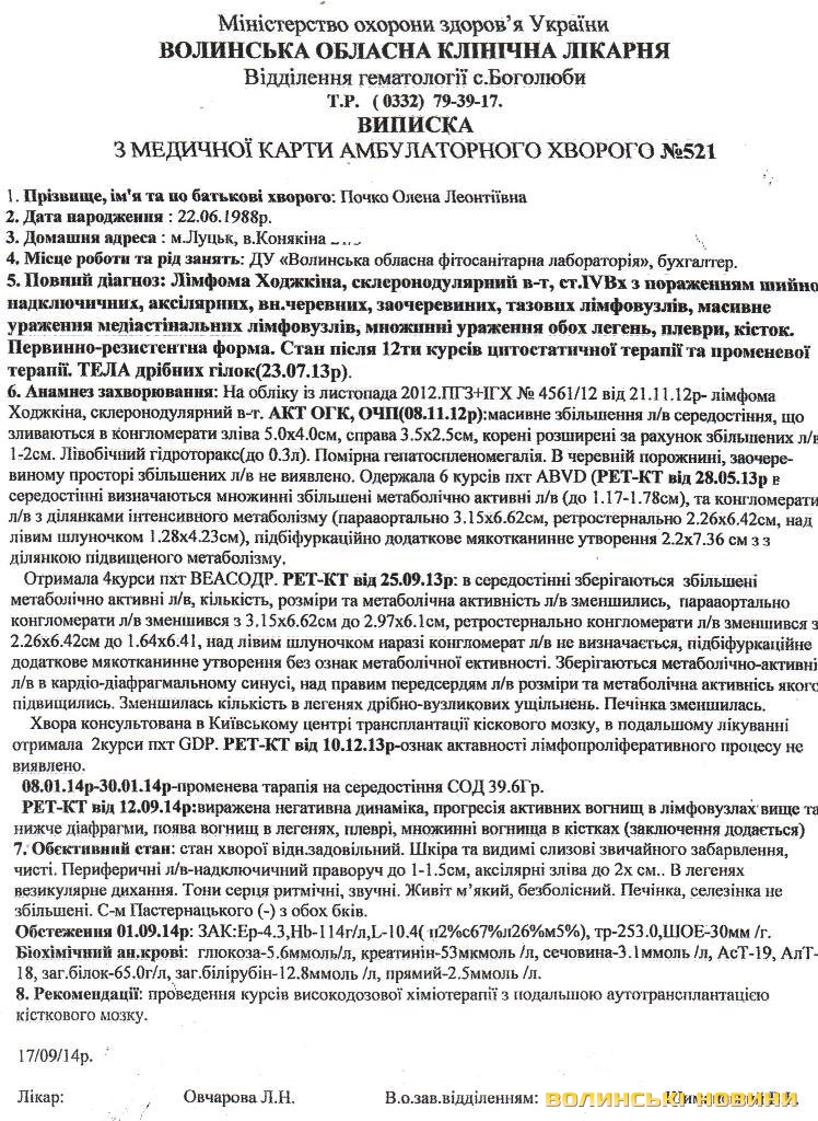 «Про хворобу ми дізналися у 2012-му році. Тоді почали лікування у нас в Боголюбах. Була початкова стадія Лімфоми Ходжкіна - 2А. Оленка пройшла 12 курсів хіміотерапії, 30 сеансів облучення. Все було добре, недуга відступила. Але зараз хвороба почала вбивати мою донечку. Під час обстеження в Києві лікарі виявили 4 стадію, пішло загострення на внутрішні органи. Тому зараз необхідно робити пересадку кісткового мозку. У Києві медики сказали, що вже запізно, і не зможуть вилікувати, а в Мінську лікарі дали нам надію на одужання. Вартість операції - 50 тисяч доларів. Ми вже заплатили трохи більше 22 тисяч доларів, ще необхідно 27 тисяч доларів. Спочатку перерахували тільки частину грошей. Бо лікарі не знали чи вдасться їм взяти клітини кісткового мозку. Але все відбулося успішно. І чекаємо вже наступного етапу – пересадки кісткового мозку», - розповідає мама Оленки.