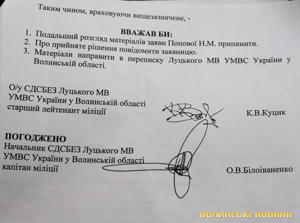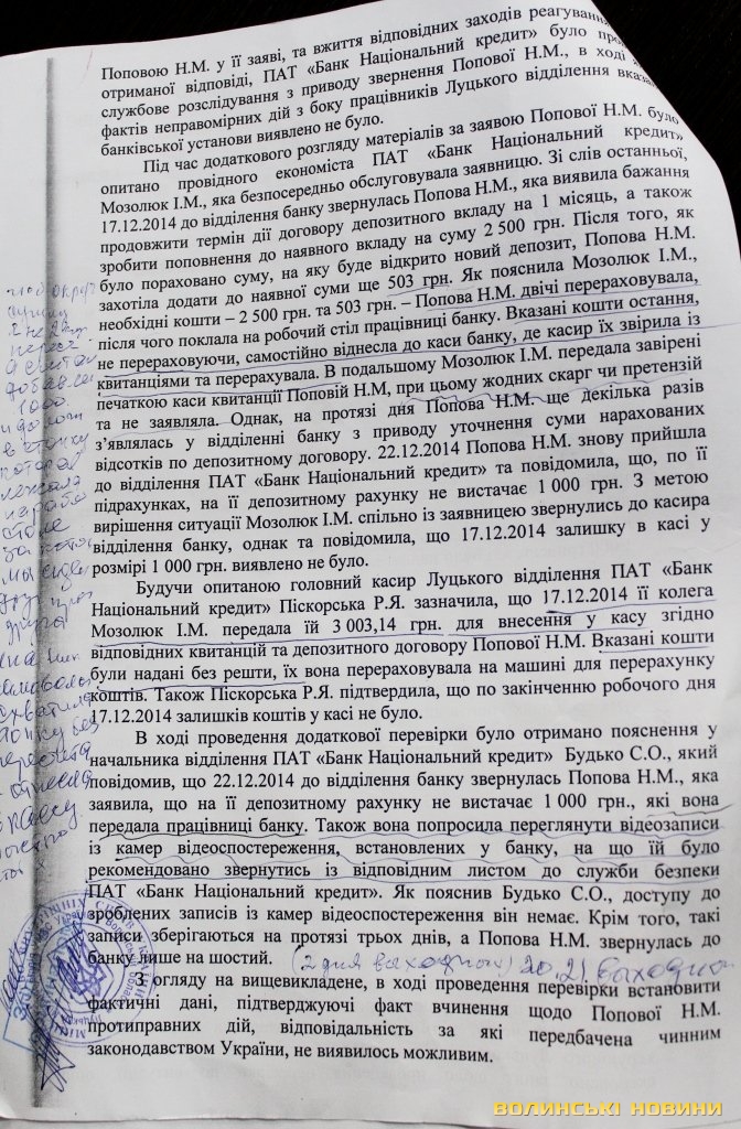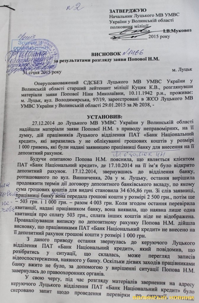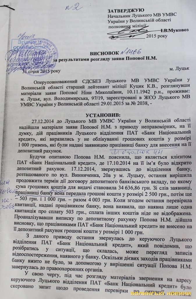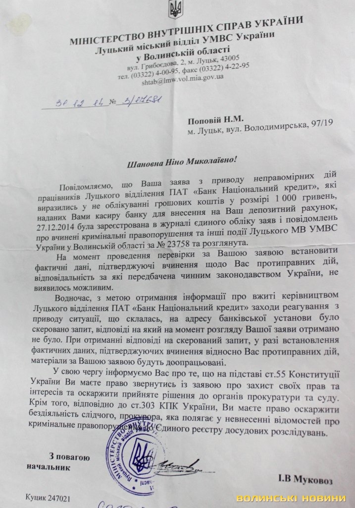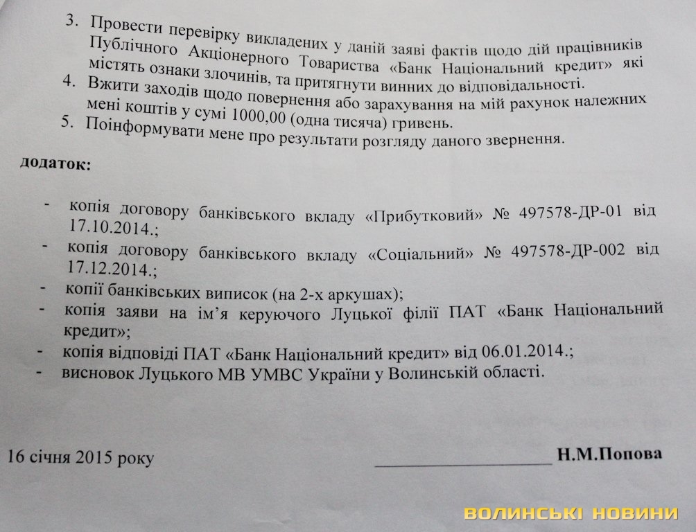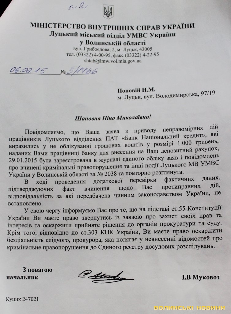 Пенсіонерка наполягає на тому, що працівниця банку обдурила її, перед тим ввійшовши в довіру, та заперечує пояснення, наведені у відповіді банку. Справедливості вона намагається досягти, звертаючись у міліцію та прокуратуру. Так, її заяву про неправомірні дії працівників Луцького відділення ПАТ «Банк Національний кредит», зареєстрували 27 грудня 2014 року. У висновку за результатами розгляду заяви, датованому 31 січня цього року, йдеться про те, що під час проведення перевірки встановити фактичні дані, що підтверджують факт вчинення проти Ніни Попової протиправних дій, не виявилось можливим. Таким чином, оперуповноважений СДСБЕЗ Луцького міськвідділу УМВС України у Волинській області старший лейтенант міліції К. В. Куцик вважає за доцільне припинити подальший розгляд матеріалів заяви.
