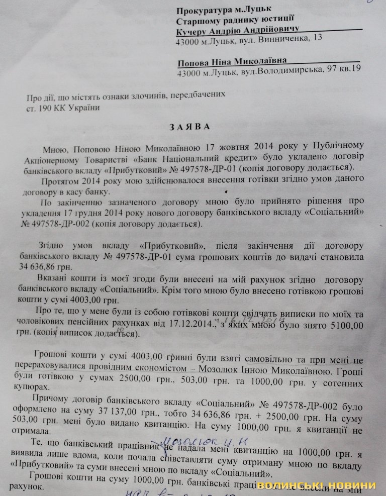 «Договір банківського вкладу «Соціальний» було оформлено на суму 37 137 гривень, тобто 34636,86 гривні + 2500 гривень. На суму 503 гривні мені було видано квитанцію. На суму 1000 гривень я квитанції не отримала», - йдеться у заяві у прокуратуру міста Луцька.