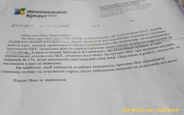 Лист із головного офісу стосовно службових перевірок у відділенні, датований 27 січня, клієнтка, з її слів, отримала лише 23 лютого. Цікаво, що у документі йдеться про те, що «було проведено ревізію каси відділення, переглянуто відеоспостереження за 17.12.2014 року». За результатами перевірок встановили, що відділення працює відповідно до нормативних документів НБУ, а працівники чітко виконують свої службові обов’язки. Порушень в роботі, недостач та надлишків у касі, як йдеться у відповіді, не виявлено. «На майбутнє, щоб уникнути подібних інцидентів, просимо Вас перевіряти отриману готівку та документи одразу після здійснення операції, не відходячи від каси», - йдеться у листі.