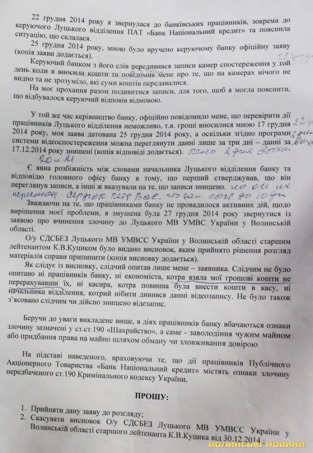 Таким чином, заявниця вважає, що в діях двох працівників банку вбачаються ознаки злочину, зазначені у статті 190 Кримінального кодексу України «Шахрайство». Вона просить у прокуратури скасувати висновок оперуповноваженого Луцького міськвідділу та здійснити перевірку викладених у заяві фактів щодо дій працівників ПАТ «Банк Національний кредит», які містять ознаки злочинів, та притягнути винних до відповідальності, а також вжити заходів щодо повернення або зарахування на її рахунок коштів у розмірі 1000 гривень.