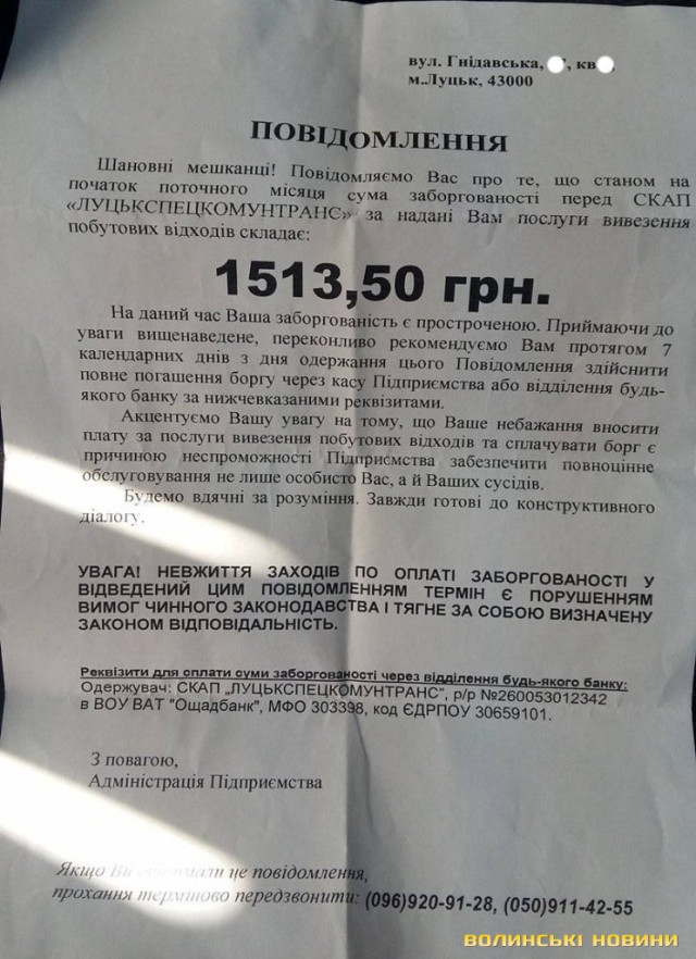 Тож яким же було здивування у чоловіка, коли він в поштовій скриньці побачив повідомлення про борг за вивіз сміття. Та й сума вказана чималенька – більше 1,5 тисячі гривень.Згодом Олександр звернувся до підприємства, аби йому пояснили, за що ж він заборгував, якщо не користувався послугами СКАП «Луцькспецкомунтранс». Після того, як його поводили кабінетами, йому порадили написати заяву, в якій описати всі обставини і пояснити, куди він діває побутове сміття.