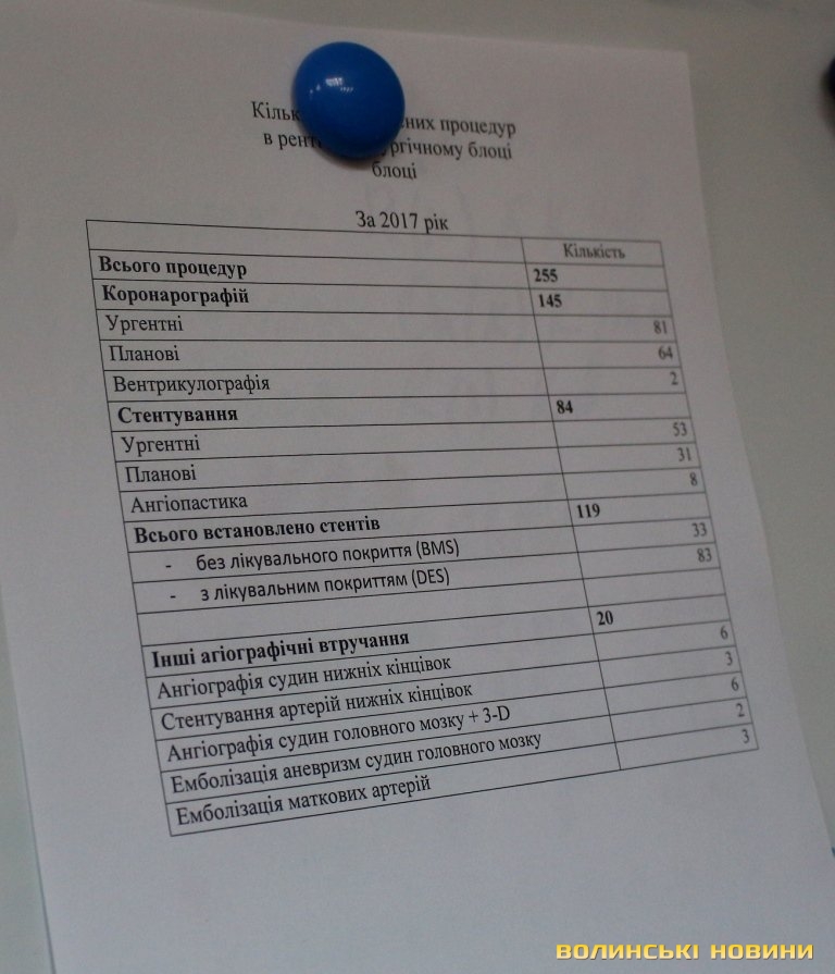 Протягом 2016 року здійснили 257 стентувань, прийняли 382 пацієнтів з інфарктом міокарда. Після стентування летальність становить лише 4,3%, після здійснення тромоболізису – 8,2%. Кількість коронарних втручань збільшилася від 103 у 2013 році до 700 у 2016 і вже 255 протягом поточного року. 70% всіх процедур здійснюють мешканцям міста. Наразі процедури фінансували з обласного бюджету в рамках програми «Волинькард», місто лише торік виділило вперше 300 тисяч гривень. До 500 тисяч гривень щороку залучали з муніципальної лікарняної каси.Лариса Духневич зауважила, що ціна стентування недешевим стентом становить до 30 тисяч гривень, а іноді пацієнту потрібно поставити одночасно 3 стенти на 3 закриті судини. Найдешевші бюджетні стенти, які купують, коштують у межах 20 тисяч. З її слів, в області 83% стентувань при гострому інфаркті міокарда роблять в міській клінічній лікарні.Роботу ангіографа продемонстрували депутатам, пояснивши, що під контролем цього апарату лікар має змогу бачити серце пацієнта під постійним рентгенівським випромінюванням, провести стент та відкрити судину. Основним агрегатом ангіографа є рентгенівська трубка, яка, як виявилося, після 4 років використання зможе працювати ще впродовж 1-6 місяців.Професор наголосив, що система лікування пацієнтів за допомогою пристрою вже налагоджена, пацієнтів привозять як з міста, так і з різних районів області, тому зараз важливо не допустити, аби ця система зруйнувалася.