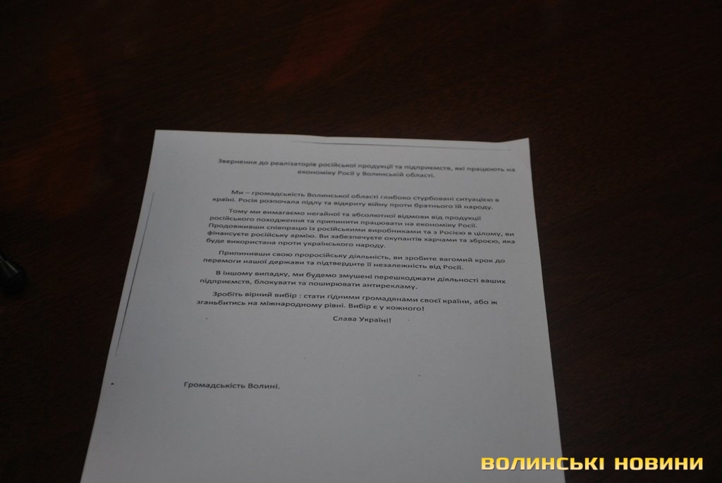 Активісти пояснюють, що купуючи продукцію російських брендів, або користуючись їх послугами українці підтримують російські війська, які здійснюють військову інтервенцію. Автомайданівці перекрили в’їзди та виїзди із заправки та попросили працівників викликати керівництво.Невдовзі на автозаправному комплексі з’явився і «начальник», який запросив активістів та журналістів на розмову до нього у кабінет.Представники Автомайдану, Правого сектора та луцького «Удару» висунули свої вимоги регіональному менеджеру з розвитку компанії «Лукойл» Віктору Прокопчуку, який також є депутатом Волинської облради, членом партії «Наша Україна».