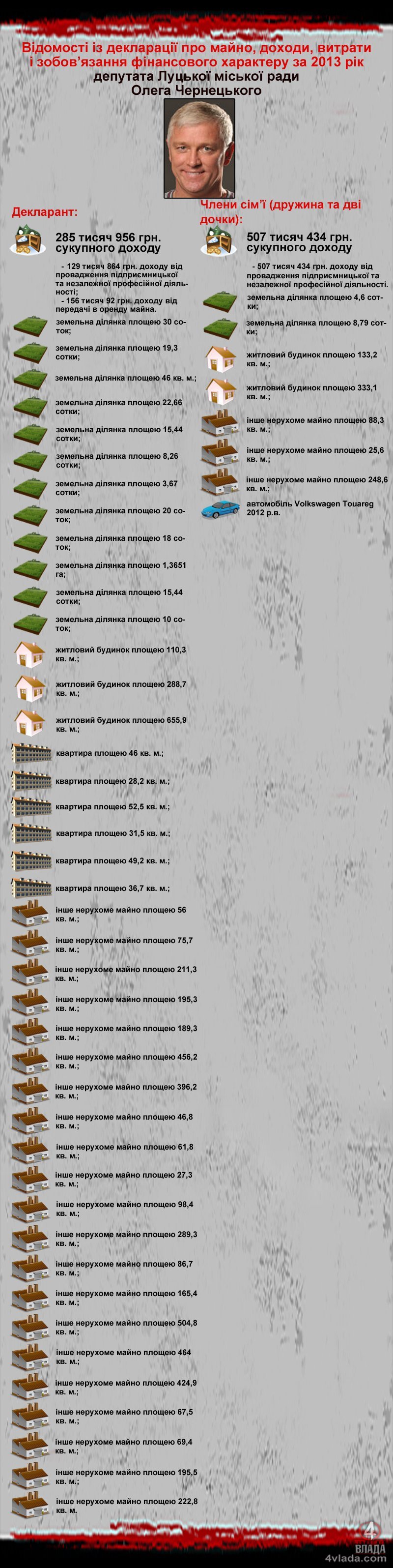 Абсолютним чемпіоном за кількістю землі та нерухомості серед половини обранців громади є депутат Луцької міської ради протягом 2010-2014 років, а нині депутат Київської міської ради, член ВО «Свобода», місцевий бізнесмен Олег Чернецький. Загалом у нього разом із членами сім’ї задекларовано за 2013 рік 14 земельних ділянок загальною площею майже у 3 гектари, 5 будинків загальною площею 1521,2 кв. м., 6 квартир загальною площею 244,1 кв. м. та 24 одиниці іншого нерухомого майна загальною площею 4667,1 кв. м. Також у членів сім’ї задекларований автомобіль.