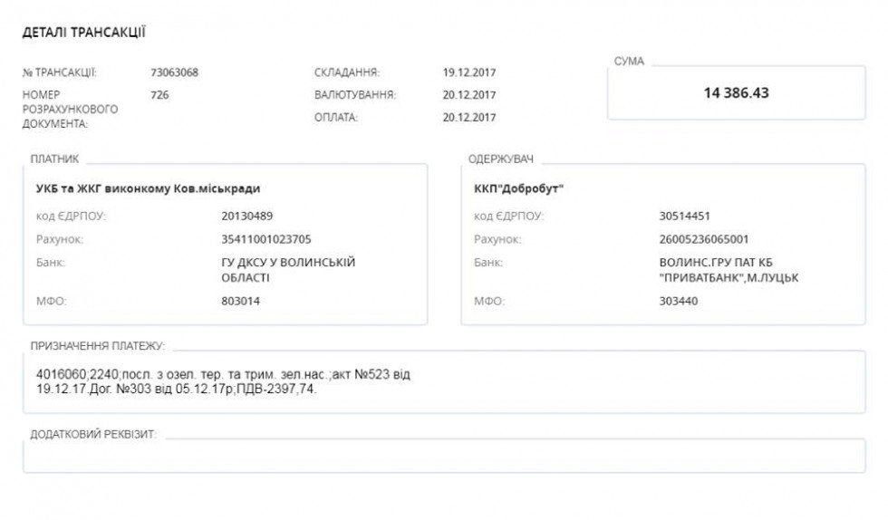 Управління капітального будівництва та житлово-комунального господарства виконкому Ковельської міської ради перерахувало комунальному підприємству «Добробут» за послуги з озеленення території та тримання зелених насаджень загалом 37 тисяч 875 гривень.