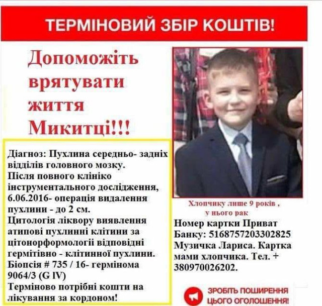 Нагадаємо, Микита потребує дороговартісного лікування в Ізраїлі, адже лікувати в Україні його відмовляються.У десятирічного Микитипід час обстеження на МРТ головного мозку виявили утвір у ділянці 3 шлуночка 25 см. Тож 6 червня 2016 року йому зробили радикальне видалення пухлини в нейрохірургічному відділені МДКЛ Львова. А тепер він потребує дороговартісного лікування в Ізраїлі.Волинська обласна благодійна організація "Радість дитинства" 16,17,18 грудня організувала благодійну акцію щодо збору коштів для Микити. Акція відбулася у ТЦ Порт Сіті, цьому посприяла майстриня Поліна Демиденко.