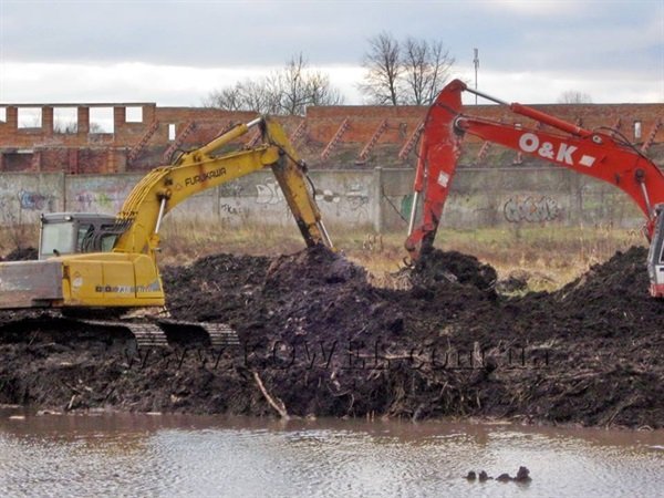 З дозволу чиновників поблизу зруйнованого стадіону «Локомотив» екскаватори цілими днями завзято вигрібають ґрунт, збільшуючи і без того велике водоймище. На одному з них можна прочитати напис: «NE GABARIT».