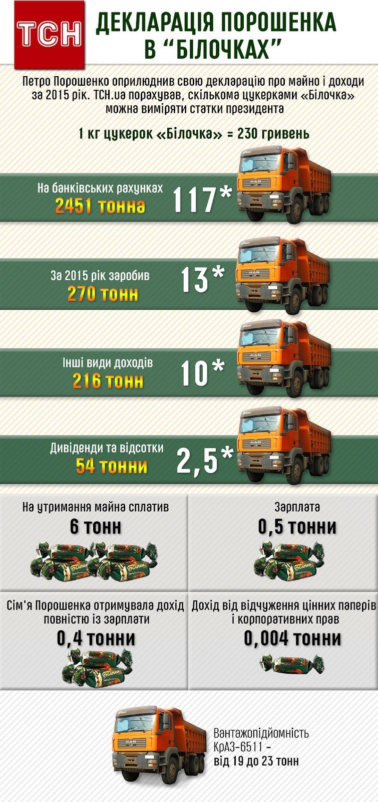 Відповідно до документа, сім'я Порошенка отримувала дохід повністю із зарплати: 88 772 гривні. ТСН.ua вирішив порахувати, скількома шоколадними цукерками "Білочка" можна виміряти статки президента. Виявилось, що деякі із пунктів декларації президента у солодкому еквіваленті не вміщаються навіть у кілька вантажівок КрАЗ. Слід зауважити, що вантажопідйомність цих вантажівок – близько 21 тонни.