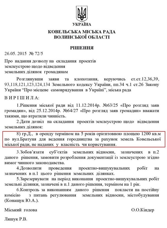Земельна оборудка відразу ж потрапила в поле зору правоохоронних органів. Відповідно до пункту 1 статті 3 Закону України «Про запобігання корупції», в цьому випадку депутат Валентина Дубій є суб’єктом відповідальним за корупційні правопорушення, оскільки вона, взявши участь в роботі 72-ї сесії, не повідомила про наявність у неї реального конфлікту інтересів і проголосувала за прийняття рішення, яким її чоловікові надано дозвіл на складання проекту землеустрою щодо відведення земельної ділянки в оренду.